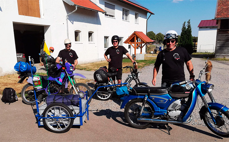 Martin von der Suzuki-GS-IG-Rhein-Ruhr, Hias von der Suzuki-GS-IG-Bayern/Opf. und Olli von der Suzuki-GS-IG-Nord tauschten ihre Motorräder gegen eine Herkules Optima, eine Yamaha DT 50 und eine Zündapp C50 Sport. Nachdem die Mopeds technisch fit gemacht waren, sollte es am Sonntag, den 19.08.2018 nun tatsächlich los gehen.