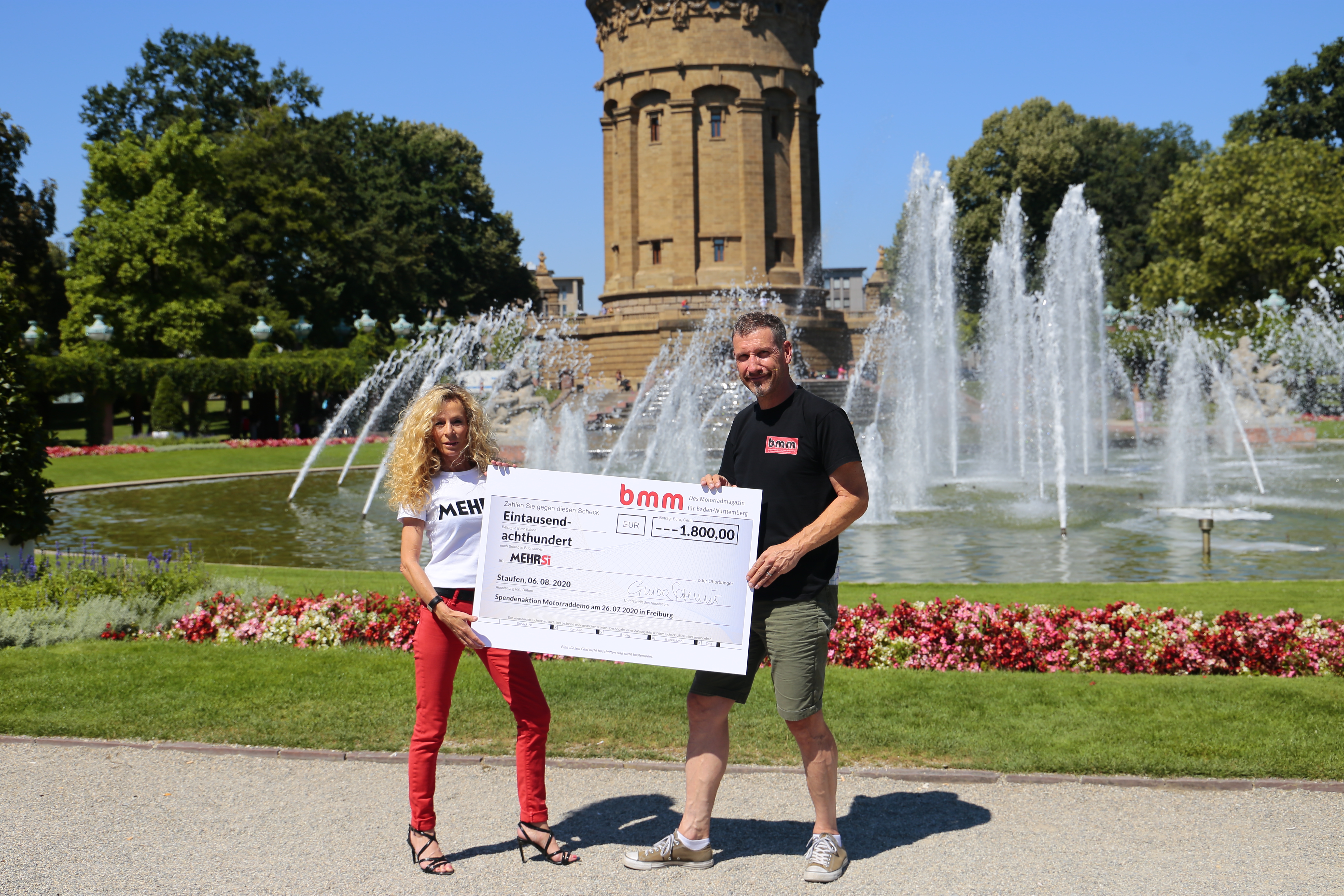 Heute trafen sich Guido Schmidt von bmm - Das Motorradmagazin für Baden-Württemberg und Monika Schwill von MEHRSi in Mannheim am Wasserturm zur Scheckübergabe! Ein Treffen auf halber Strecke, jedoch mit einem riesen Scheck! Das Ergebnis dieser Spendenaktion, initiiert von Guido Schmidt anläßlich der Motorrademo in Freiburg, am 26. Juli 2020, wurde heute an MEHRSi übergeben! Wir sind überwältigt und sagen DANKE!