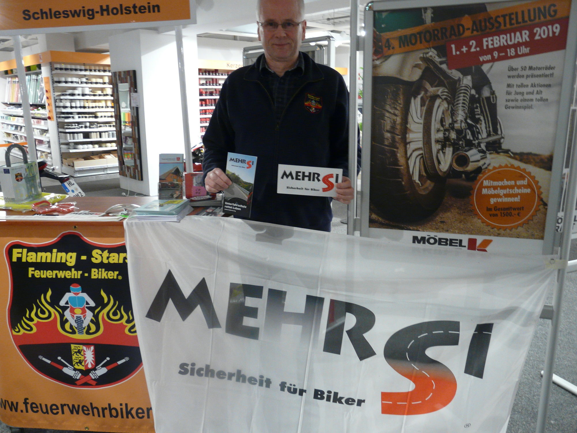 Motorräder zwischen Einbauküchen und Schränken präsentierte MÖBEL KRAFT, vom 1. bis 2. Februar 2019, am Standort in Bad Segeberg, Schleswig-Holstein. An dieser, inzwischen vierten Motorradausstellung nahmen auch wieder die Flaming Stars Schleswig-Holstein (FSSH) teil. Die Feuerwehr-Motorradfahrer informierten über ihre Interessengemeinschaft, deren Termine und ihre Sozialprojekte, wie beispielsweise die Tafelstiftung SH/HH oder das Kinderhilfswerk FIRES. Auch wurden entsprechende Flyer von MEHRSi verteilt. Erklärte Aufgabe von MEHRSi ist es, deutschlandweit die Leitplanken aller für Motorrad- fahrer gefährlichen Kurven mit einem Unterfahrschutz ausstatten zu lassen. Zusätzlich gab es Informationen über „Runter vom Gas“, einer Kampagne des Bundesministerium für Verkehr und digitale Infrastruktur.