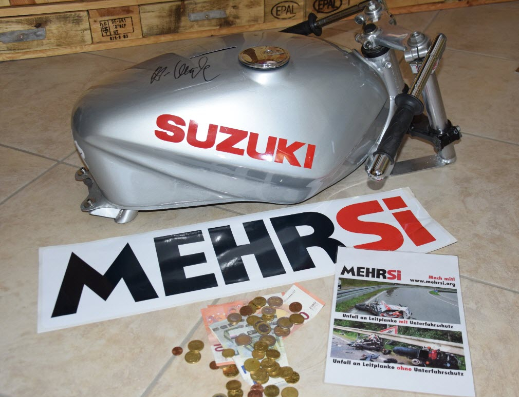 Der Katana Owners Club feierte das 40jährige Vorstellungs-Jubiläum der Suzuki-Katana Serie und das mit großem Stand auf der Motorräder Dortmund. Dazu veranstalteten die Clubmitglieder auch noch spontan eine Spendenaktion für MEHRSi. Als Spendenbox diente ein Original-Tank der Katana. Zum Messeende befanden sich 83,62 Euro im Tank, den der Katana Owners Club Germany auf glatte 100 Euro aufrundete! Tolle Sache! Wir von MEHRSi sagen DANKE!
