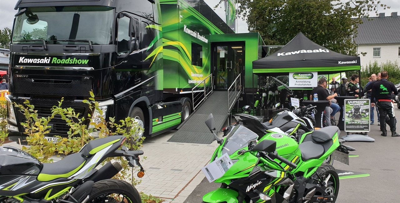 Bei der Kawasaki Roadshow kann man aktuelle Kawasaki-Modelle fahren und dabei auch gleich Gutes tun! Unter www.kawasaki-roadshow.de findet man alle Termine und Testfahrt-Motorräder der Roadshow-Teams. Hier kann man sich sein Wunschmodell und ein Zeitfenster für die Probefahrt aussuchen. Ganz wichtig: Aufgrund der Corona-Vorschriften und der Beschränkung der Personenzahlen sind Probefahrten nur nach vorheriger Buchung auf dieser Webseite möglich! Spontane „Vor-Ort-Fahrten“ sind leider nicht durchführbar!
