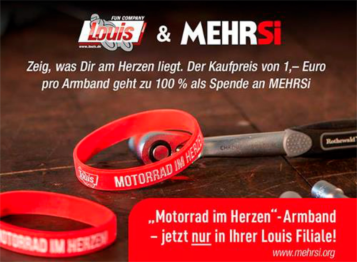 Mit diesem Armband, kannst Du zeigen was Dir am Herzen liegt! Gleichzeitig tust Du noch etwas Gutes, denn der Kaufpreis von 1€ pro Stück geht zu 100% als Spende an MEHRSi. Somit sorgst Du mit dafür, dass deutschlandweit die Leitplanken aller für Motorradfahrer gefährlichen Kurven mit einem Unterfahrschutz ausgestattet werden. Ab sofort in allen deutschen und österreichischen Louis-Filialen, solange der Vorrat reicht. #motorradimherzen