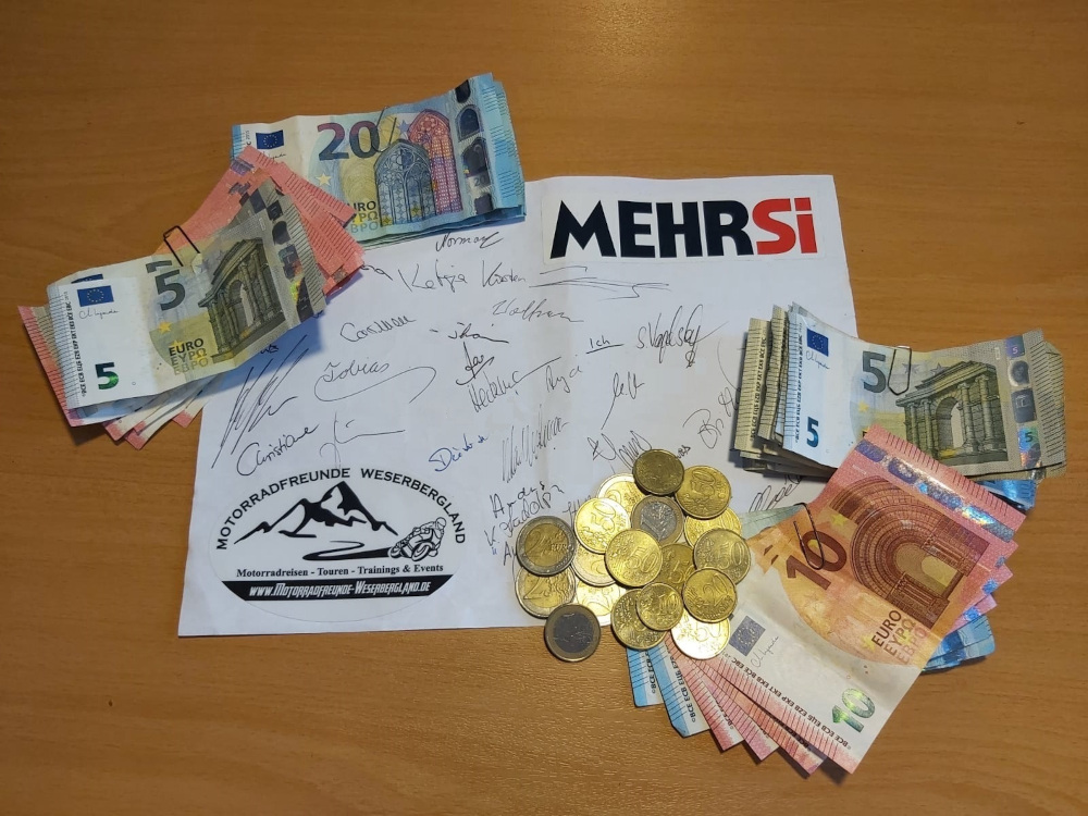 So kam auf unserer MEHRSi Spendentour 2023 und auf unserer Saisonabschlussfeier 2024 der Motorradfreunde - Weserbergland, ein beachtlicher Spendenbetrag zusammen. Aber nicht nur Mitglieder aus unserer Community haben sich daran beteiligt, sondern auch Bikertreffs aus dem schönen Weserbergland, wie z.B. Cafe & Bistro Biketreff - Auf dem Ith, die Villa Löwenherz und auch die Tonenburg. Zusätzlich sind Trinkgelder, welche man uns direkt überreicht hat, auch gleich in die MEHRSi Spendendose gewandert, denn hier sind sie richtig platziert.