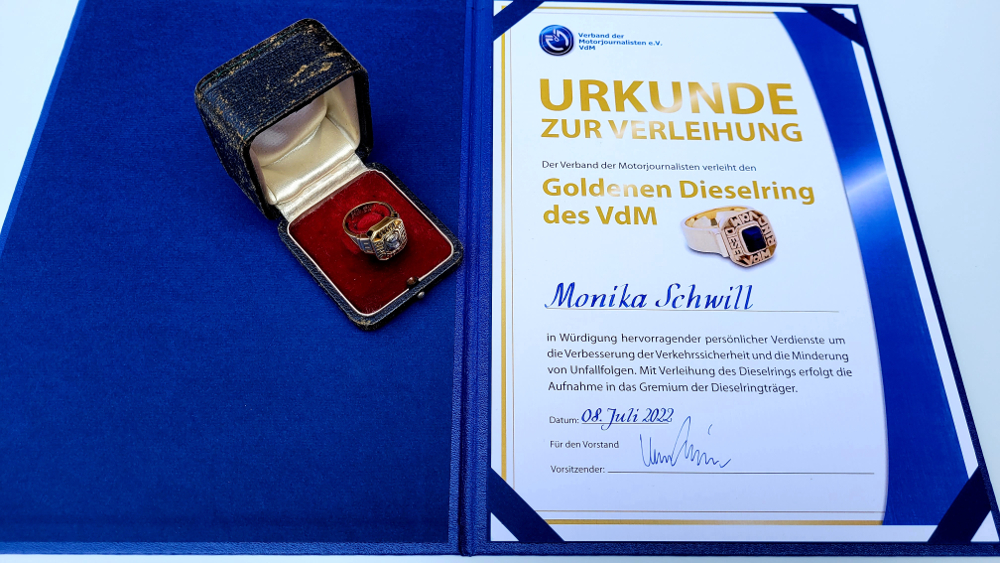 Mit dem Goldenen Dieselring, in den ein Splitter des ersten Versuchsmotors von Rudolf Diesel aus dem Jahr 1893 eingearbeitet ist, zeichnet der Verband der Motorjournalisten seit 1955 jährlich Persönlichkeiten aus, die sich um die Verkehrssicherheit oder die Verringerung von Unfallfolgen verdient gemacht haben. Monika Schwill, die diesjährige Preisträgerin, ist das 75. Mitglied und die vierte Frau im Kreis der Dieselringträgerinnen und Dieselringträger, in dem mit Ingenieuren, Medizinern, Betriebswirten, Juristen oder Verkehrswissenschaftlern Experten aus den unterschiedlichsten Fachdisziplinen vertreten sind.