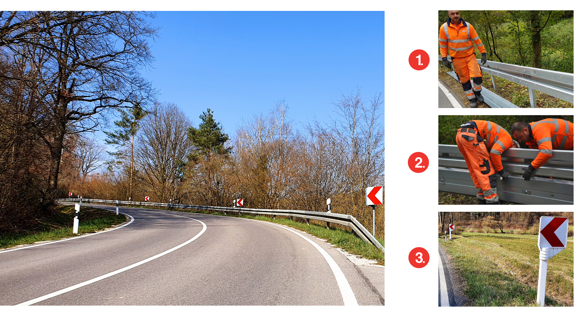 In dieser Kurve verunglückte ein Motorradfahrer schwer! Demnächst: 1. Neue Schutzplanken, 2. Unterfahrschutz, 3. Ganz neues Sicherheitsfeature: Flexible Kurvenleittafeln. Die ausführende Behörde und MEHRSi teilen sich sämtliche Kosten.