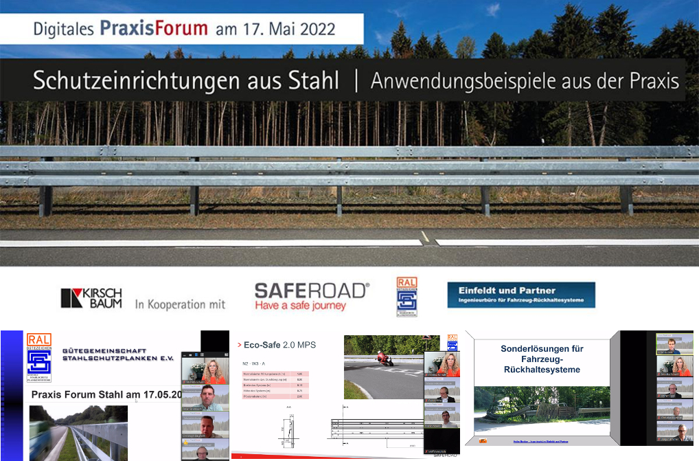 Gestern fand das digitale Praxis-Forum „Schutzeinrichtungen aus Stahl“ statt. Eingeladen hat der Kirschbaum Verlag in Kooperation mit Saferoad RRS, Gütegemeinschaft Stahlschutzplanken e.V. und Ingenieurbüro Einfeldt und Partner.
