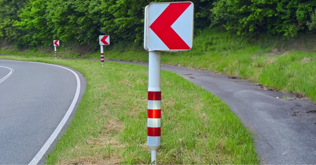 Für Motorradfahrer ist es überlebenswichtig, den Verlauf von Kurven möglichst gut und frühzeitig zu erfassen. Dabei helfen Fahrbahnmarkierungen und Leitpfosten sowie Richtungstafeln als "optische Führung". Je nach Kurvenradius gelten dabei festgelegte Abstände der Leitpfosten – von 50 Meter bei Radien über 600 Meter bis zu engen drei Metern Abstand bei Radien kleiner als 20 Meter. Das Problem dabei: Die auf starren Metallpfosten montierten Richtungstafeln sind bei einem Anprall ein unnachgiebiges und äußerst gefährliches Hindernis.