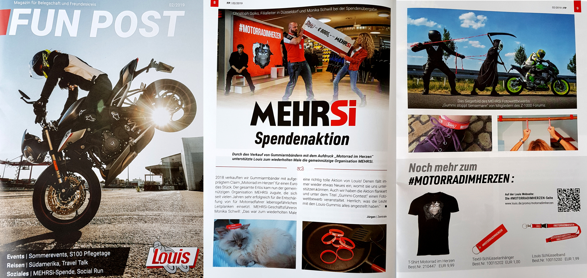 Die neue FUN POST von Louis Motorrad im Briefkasten. Gleich Päuschen mit ner Tasse Kaffee. Auf Seite 8 und 9 schon riesen Freude!!! Die Louis Spendenaktion war ganz großes Kino – Gummi-Armbänder wurden verkauft und der Erlös ging zu 100 % an MEHRSi. Der Hammer!!! Parallel zur Gummi-Armband Aktion von Louis starteten wir einen Fotowettbewerb, den „Gummi-Contest“. Unzählige Fotos haben wir erhalten, wie das von Marlies Greber, die ihren Kater Uniko die Krone aufsetzte, die Pfannenringe, Gummi-Armbänder als Klimmzugverstärker, etc. Die Sieger waren schnell klar: Die „Takko-Bande“ (Bob Bobinski, Marc Micheel, Robert Räke u. Niels Freiberger) vom z1000-forum mit ihrem unglaublichen Sensenmann Foto.