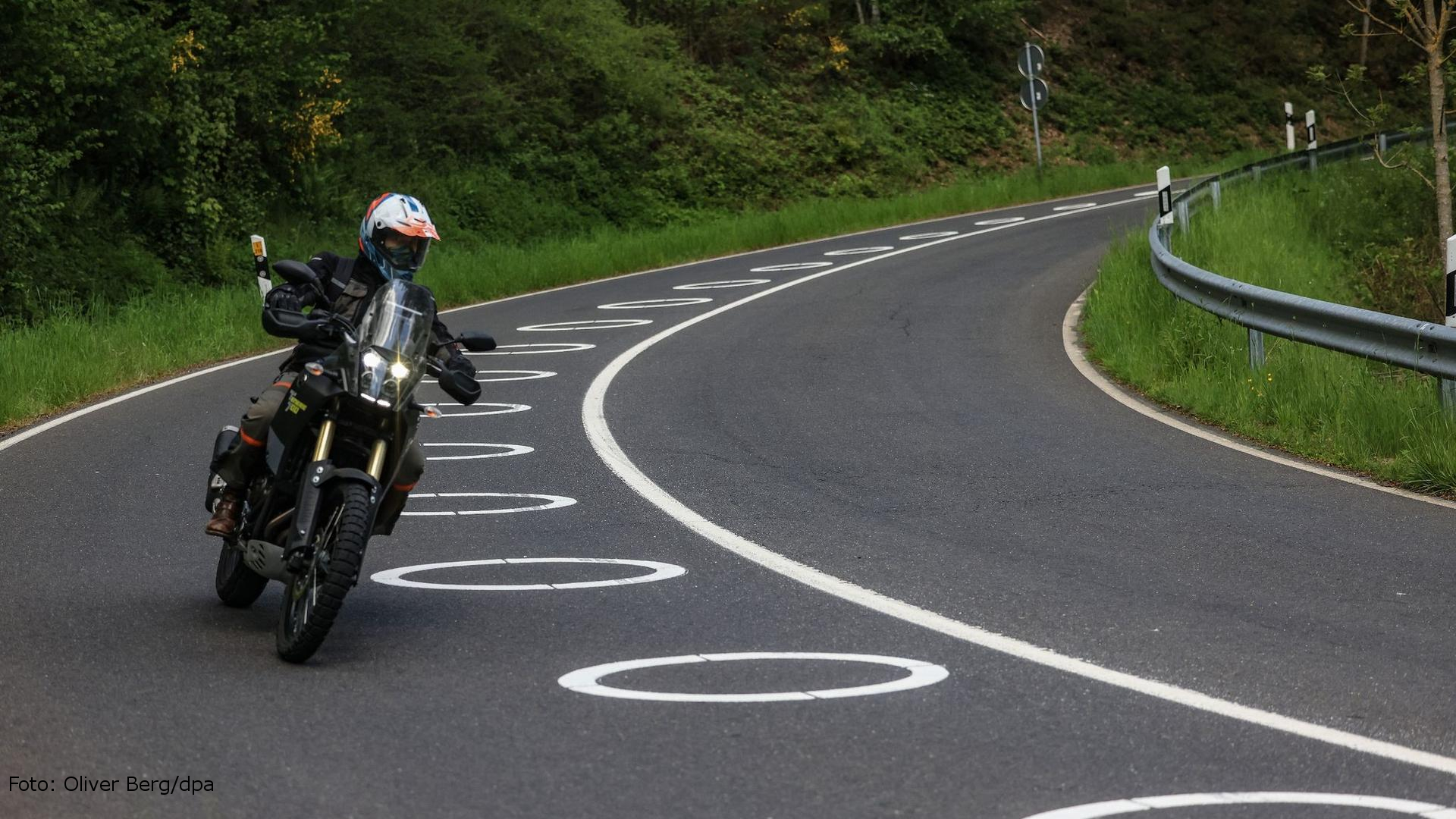 Seit Mai 2023 werden in zwei Linkskurven der „Panoramastraße“ in der Eifel ellipsenförmige Fahrbahnmarkierungen getestet. Diese sollen verhindern, dass Motorradfahrer mit Kopf und Oberkörper auf die Gegenfahrbahn kommen.